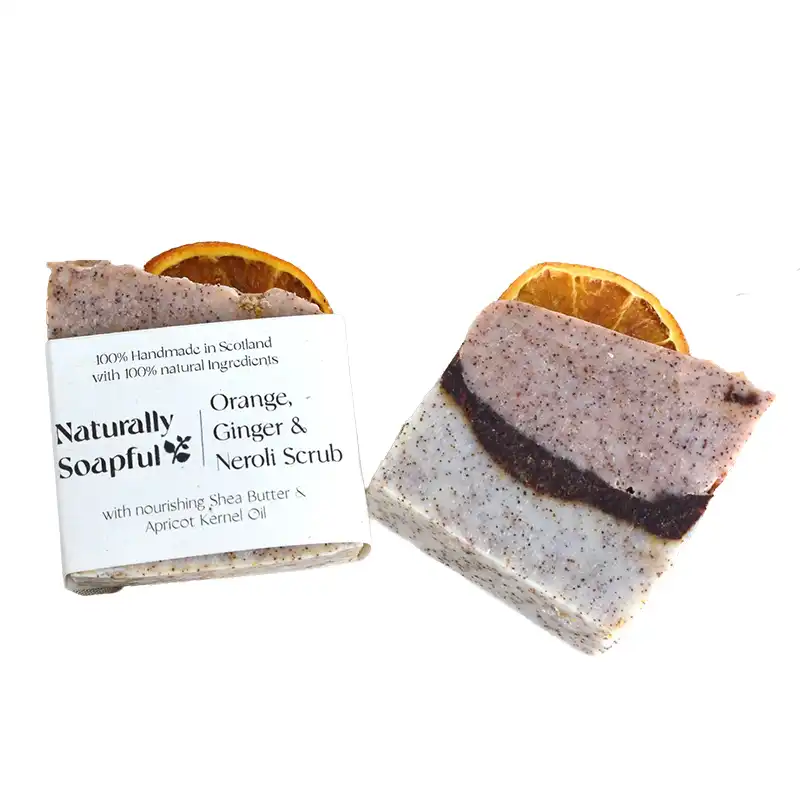 The handmade Orange Ginger and Neroli Scrub Soap Bar is created in Scotland using traditional apothecary methods and natural ingredients. The soap has a beautifully stimulating feel thanks to the finely milled peach stone which offers a gentle exfoliating touch. The combination of citrus, ginger and neroli brings a lively yet soothing aroma, while the natural oils and butters create a creamy nourishing lather that is kind to the skin.