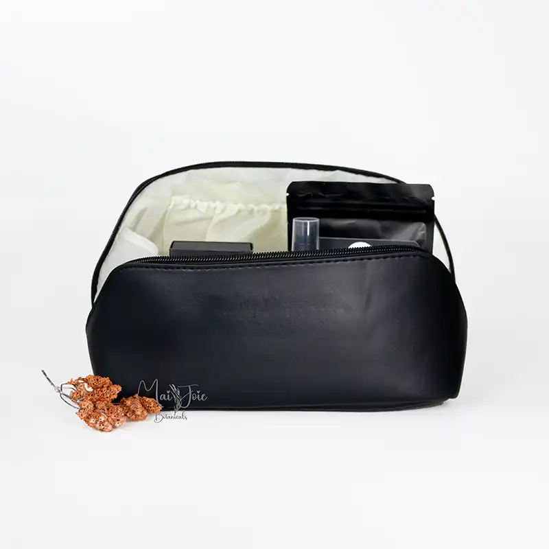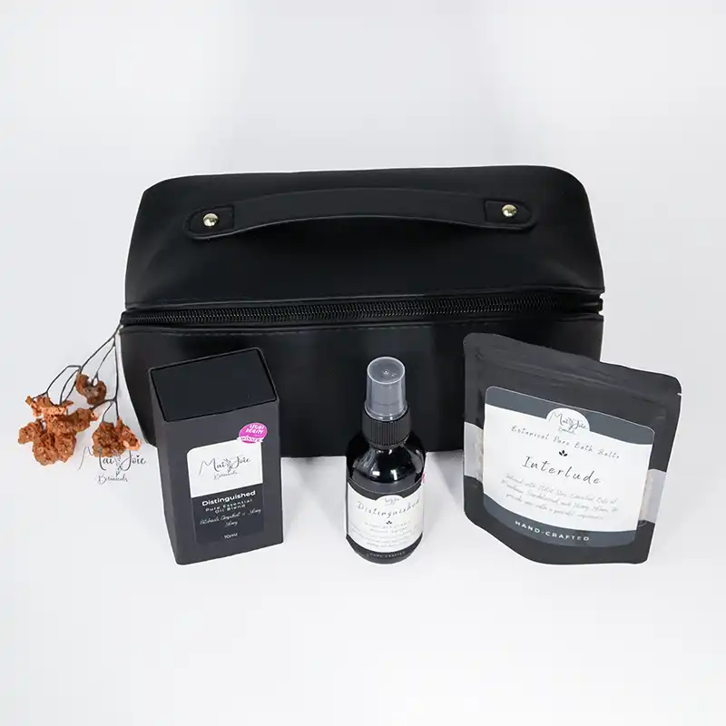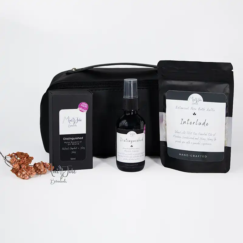 The Distinguished Gentlemen’s Gift Bag is a stylish men’s aromatherapy set featuring the Distinguished Room Spray, Pure Essential Oil Blend, and Interlude Bath Salts, all packed in a sleek eco-friendly black wash bag.